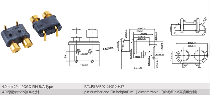 Spring loaded connector 2P 4.0mm pitch pogo pin R/A Type